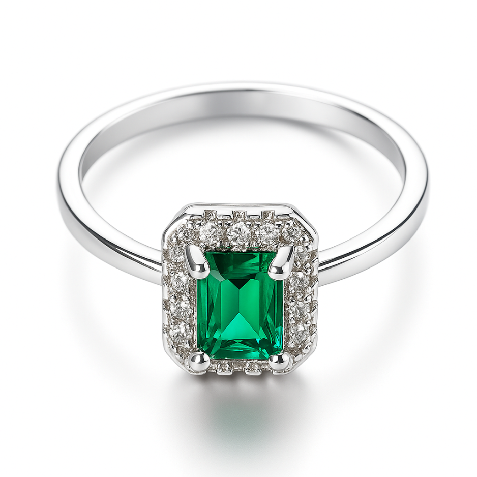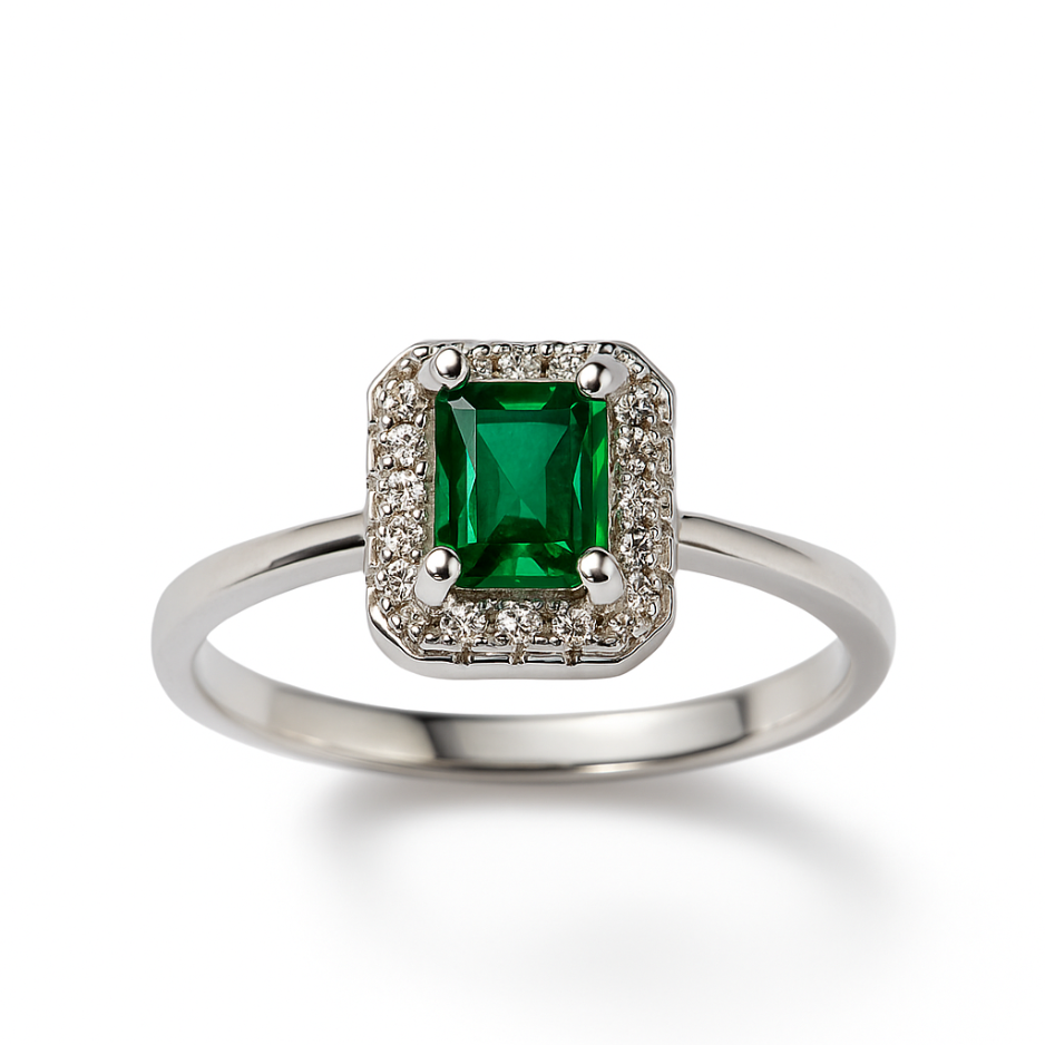 An elegant ring adorned with a vibrant emerald-cut green stone framed by a halo of shimmering accents.